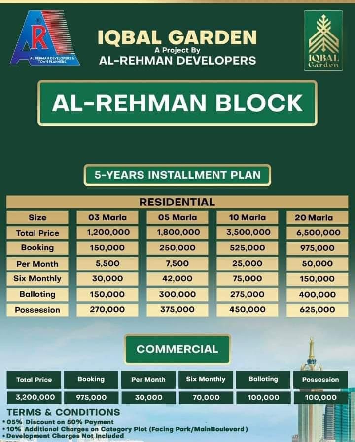 Residential plots as well as commercial plots of various sizes are available for sale in Iqbal Garden Lahore on easy installment plan. Iqbal Garden is the first RUDA approved housing project in Lahore. You can buy plots of various sizes including 3 Marla, 5 Marla, 7 Marla, 10 Marla and 1 Kanal with flexible installment payment plan spanning over 4 years. Below are the details about payment plan of Residential Plots in Al Rehman Block: