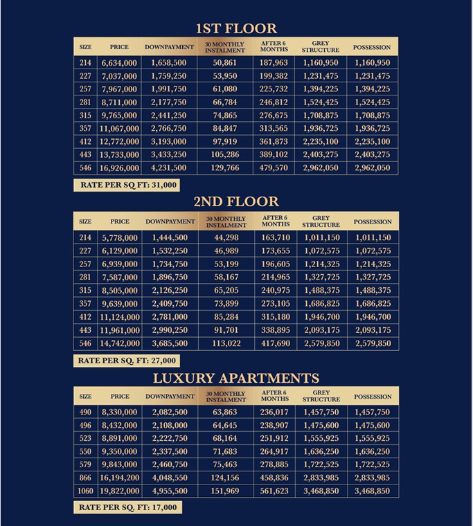 Options for down payments, monthly installments over three years, payments at the gray structure stage, and final payments upon possession are all included in the brochure’s payment plans.